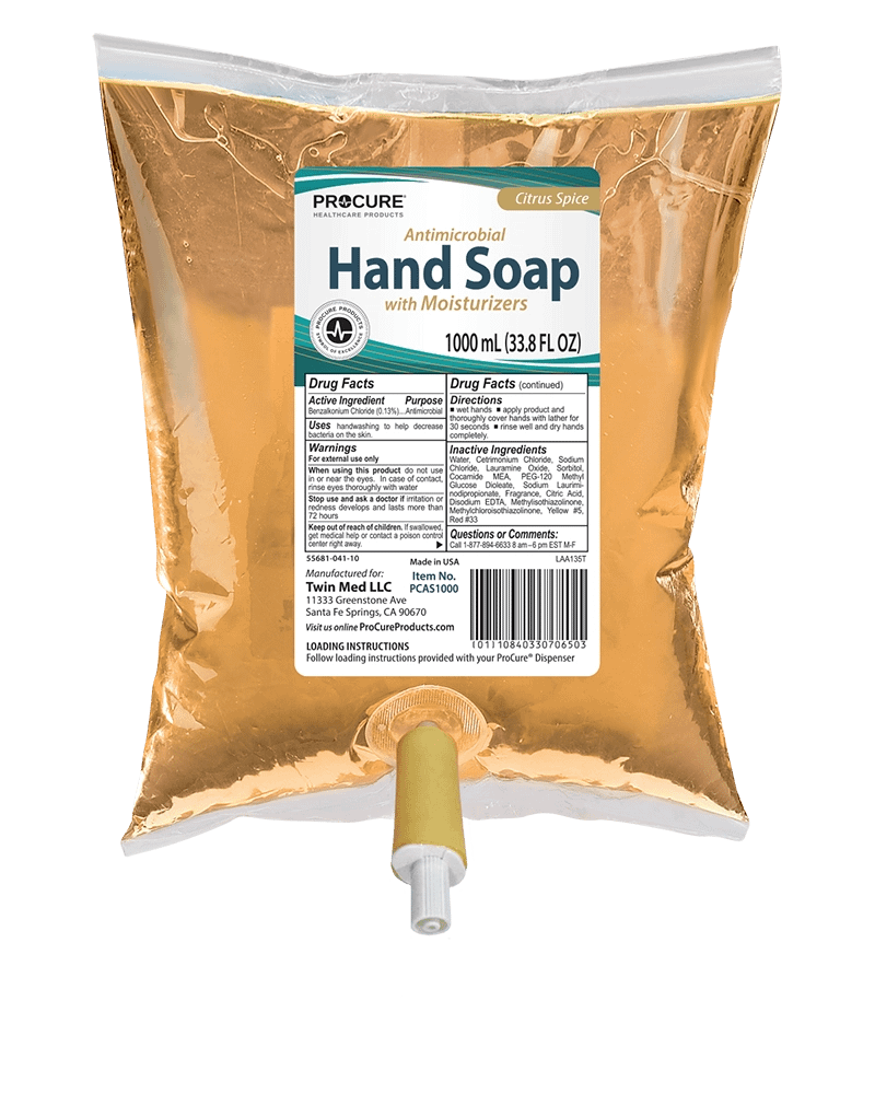 ProCure Antimicrobial Hand Soap is a skin-friendly formula with 0.13% Benzalkonium Chloride that kills 99.99% of common microorganisms—all without Triclosan. It lathers quickly for thorough cleansing while moisturizing agents help prevent dryness. With its transparent amber appearance and refreshing Citrus Spice fragrance, it leaves hands clean, soft, and deodorized—ideal for healthcare, food service, and other professional settings.