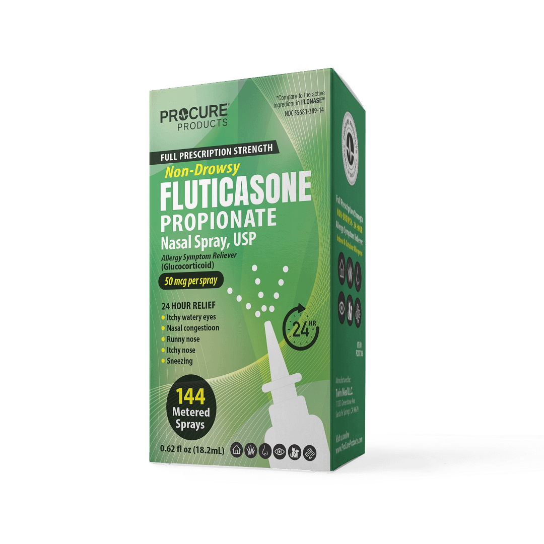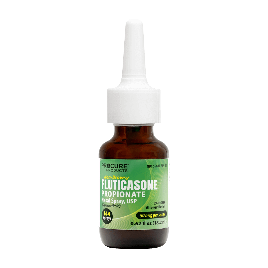 ProCure Fluticasone Propionate Nasal Spray provides powerful, 24-hour, non-drowsy relief from nasal allergy symptoms such as congestion, sneezing, and a runny or itchy nose. This corticosteroid spray targets inflammation directly at the source to help patients breathe easier and feel better all day and night. Suitable for daily use, it delivers trusted efficacy and value in a convenient, easy-to-use pump bottle—making it a smart, affordable choice for long-lasting allergy management.
