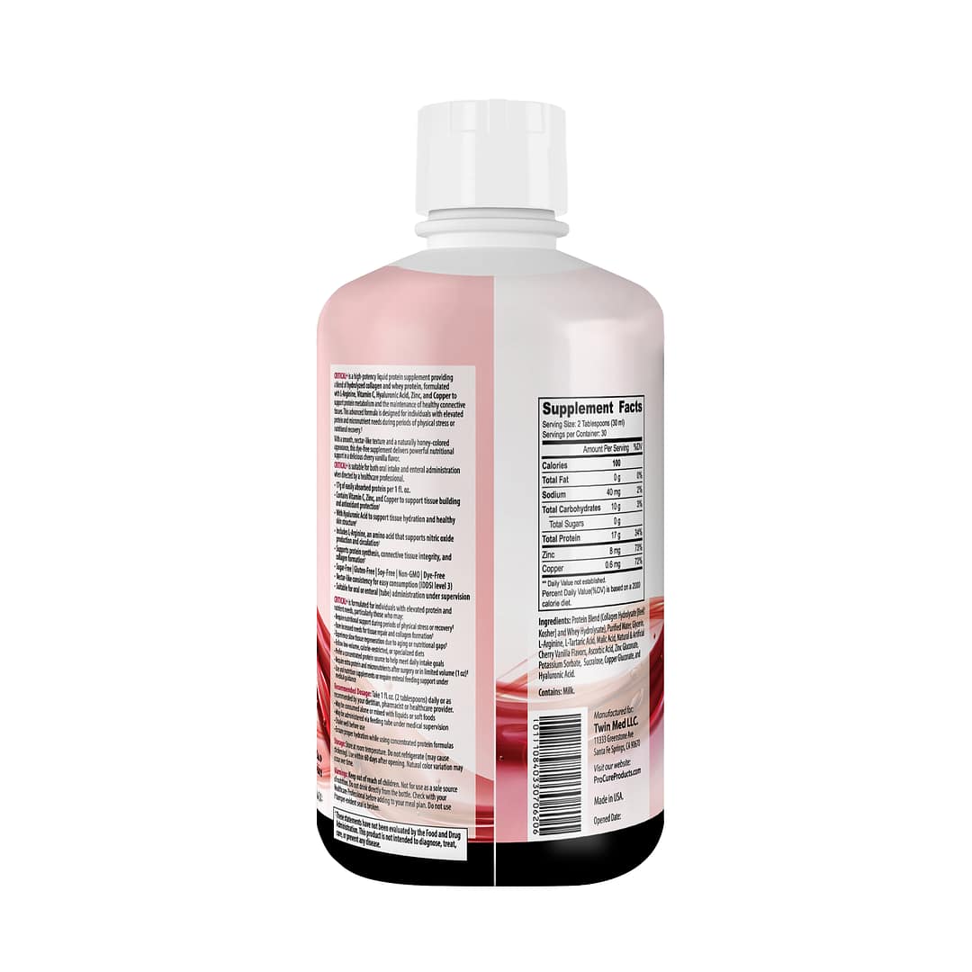 ProCure CRITICAL+ is a high-potency liquid protein supplement providing a blend of hydrolyzed collagen and whey protein, formulated with L-Arginine, Vitamin C, Hyaluronic Acid, Zinc, and Copper to support protein metabolism and the maintenance of healthy connective tissues. This advanced formula is designed for individuals with elevated protein and micronutrient needs during periods of physical stress or nutritional recovery.† With a smooth, nectar-like texture and a naturally honey-colored appearance, this dye-free supplement delivers powerful nutritional support in a delicious cherry vanilla flavor.